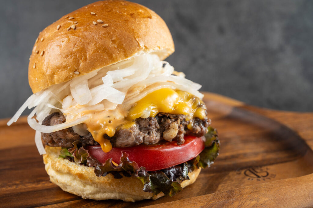 ジューシーな肉厚パティにチェダーチーズとフレッシュの淡路島玉ねぎをトッピングした『オリジナルバーガー』。その他、『スパーキーオニオンバーガー』はフライした淡路島玉ねぎをサンドし、サクサクとした食感とふわりと広がる玉ねぎの香ばしい香りと甘みがクセになります。