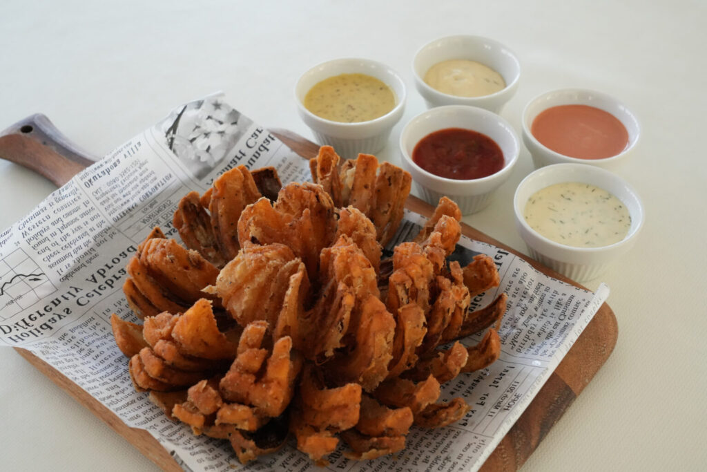 “ミエレ ザ ダイナーに来たらまずはコレ!”とおすすめしたいのが、淡路島産玉ねぎを丸ごと一個使用した「淡路玉ねぎのオニオンブロッサム」。