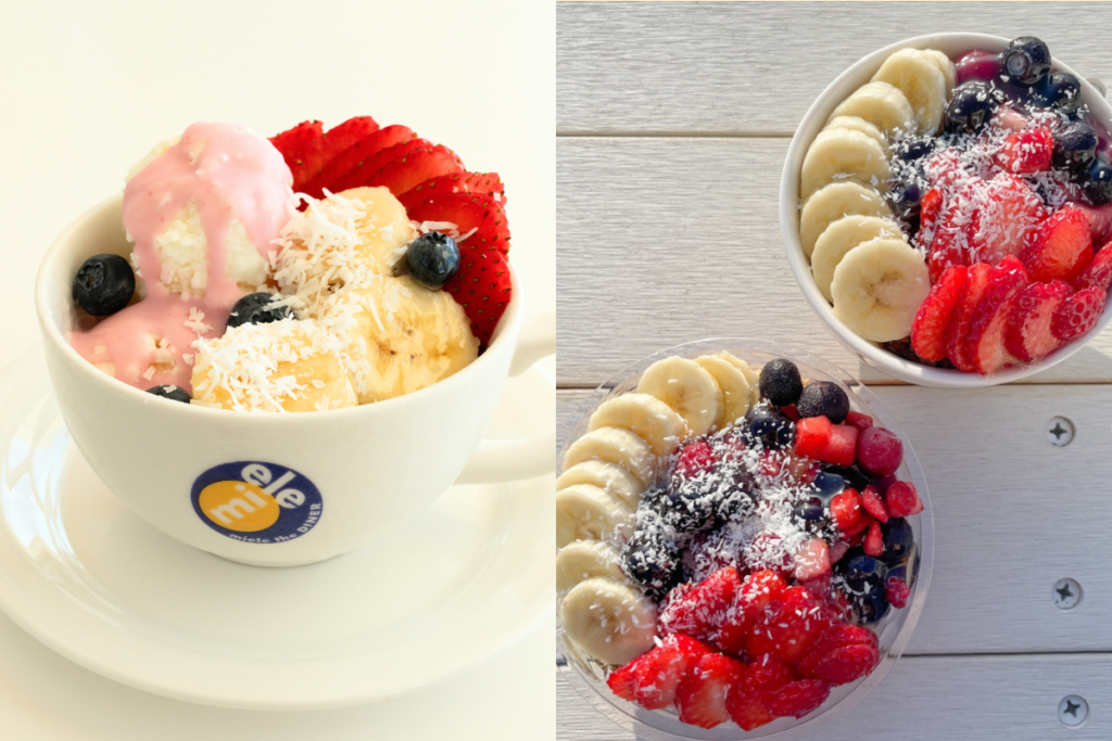 罪悪感少なく食べられる人気スイーツ!トッピングにはグラノーラ他、バナナ・イチゴ・ミックスベリーにはちみつとココナッツをトッピング。